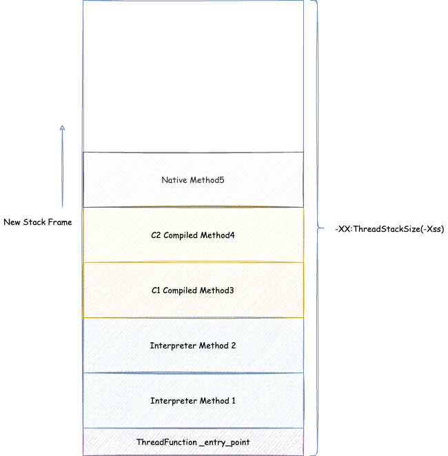 -XX:StackYellowPages. When stack expansion reaches this zone, aSIGSEGVoccurs, triggeringStackOverflowError. The yellow pages are temporarily mapped to provide space for exception handling.Red Zone: Controlled by