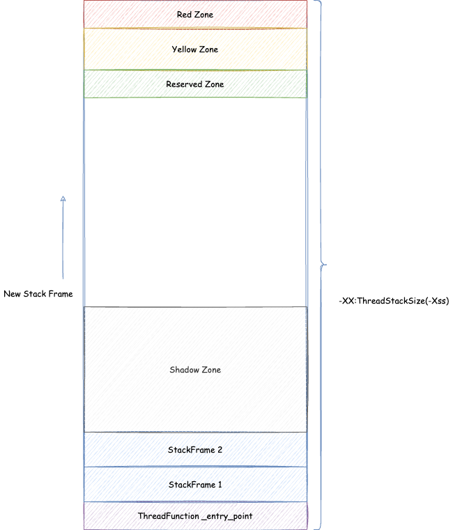 -XX:StackReservedPages. Introduced in Java 9 (JEP 270) to protect critical sections (likeReentrantLock) from inconsistent states duringStackOverflowError.Shadow Zone: Controlled by